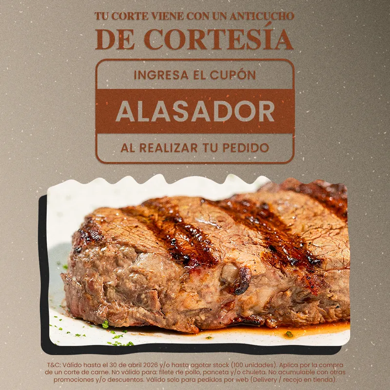 Por la compra de tu corte de carne preferido, te obsequiamos el anticucho. Ingresando el cupón ALASADOR al momento del pago.